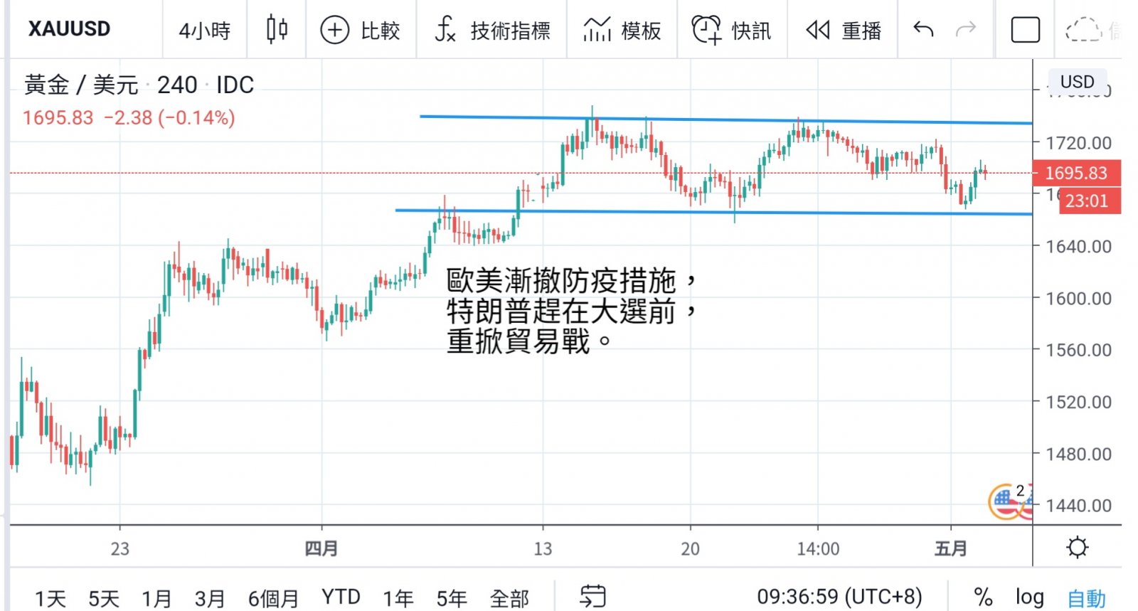 However, US President Trump suddenly announced on Friday that he would levy a trillion US dollars in tariffs on China to punish China for concealing the virus epidemic.  This remark once again disrupted the economic situation, and investors chose to return to the safe haven area, eventually closing at 1,698 US dollars.