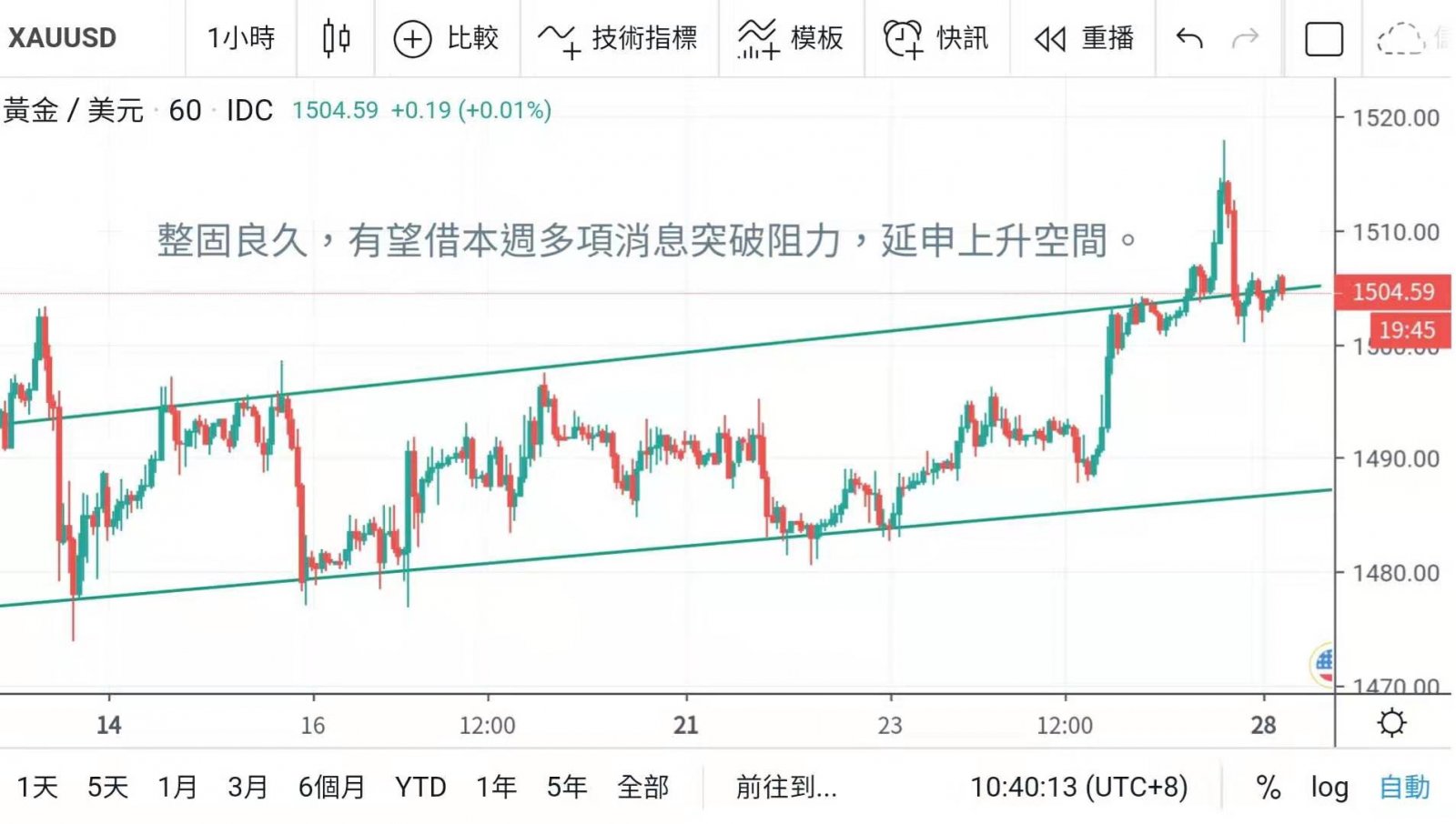金價周初曾因英國避過硬脫歐風險而受壓,最低跌至1480水平,但守穩此上升軌支持位後,如預期盤,美元的上升只會稍為削害金價表現,但無礙整體升勢的發展。