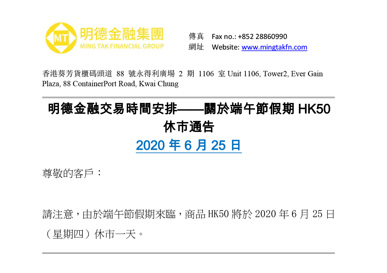 Announcement on the Closure of HK50 on Dragon Boat Festival Holiday