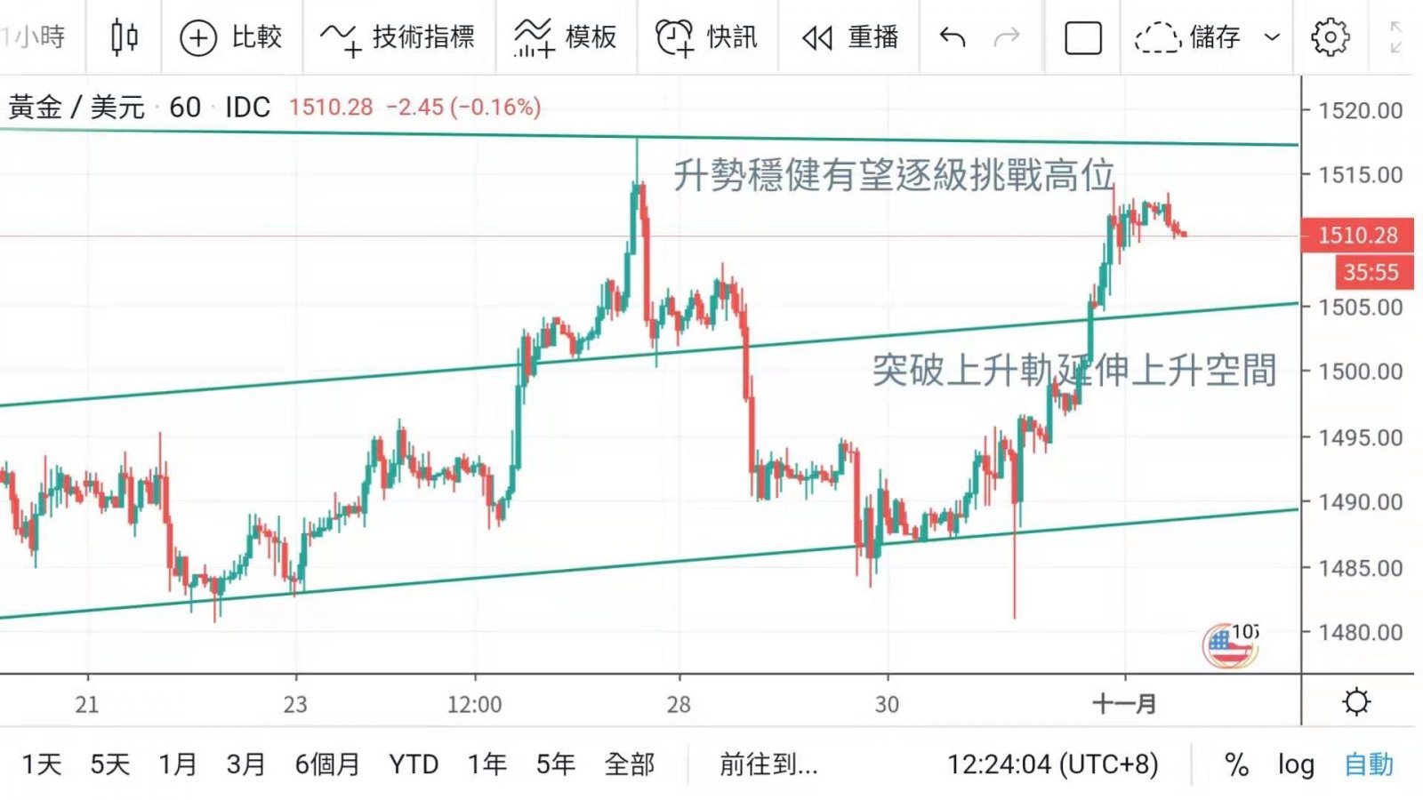 金價升勢出現突破,升穿整固上升軌後,延伸升幅目標至1520關口,但升勢今晚會先面臨考驗;