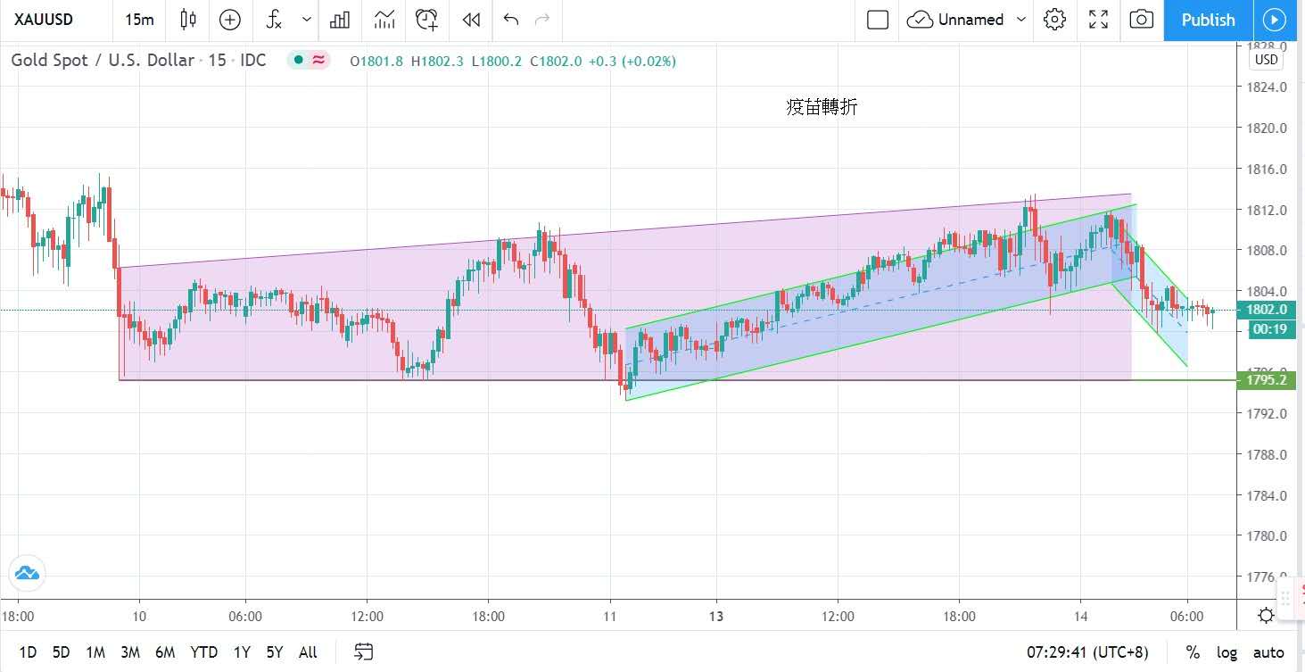 但又遇上疫苗消息而輾轉下跌,最終收報每盎司1802美元,升4美元。
