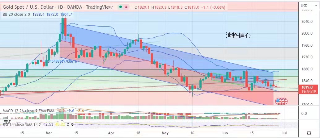It is still possible for the US economy to land softly. However, yesterday's performance of the gold market was also obviously constrained by the gloom of the Fed's sharp interest rate hike. The highest gold price was $1,829.5, and the lowest was $1,818.5.