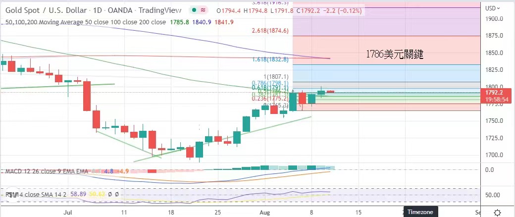 Risk sentiment once pushed up the price of gold to $1,800.5, but the United States announced that labor costs rose in the second quarter, and the increase in the price of gold narrowed, with the lowest price of gold reaching $1,783.3 and finally reaching $1,794.4.