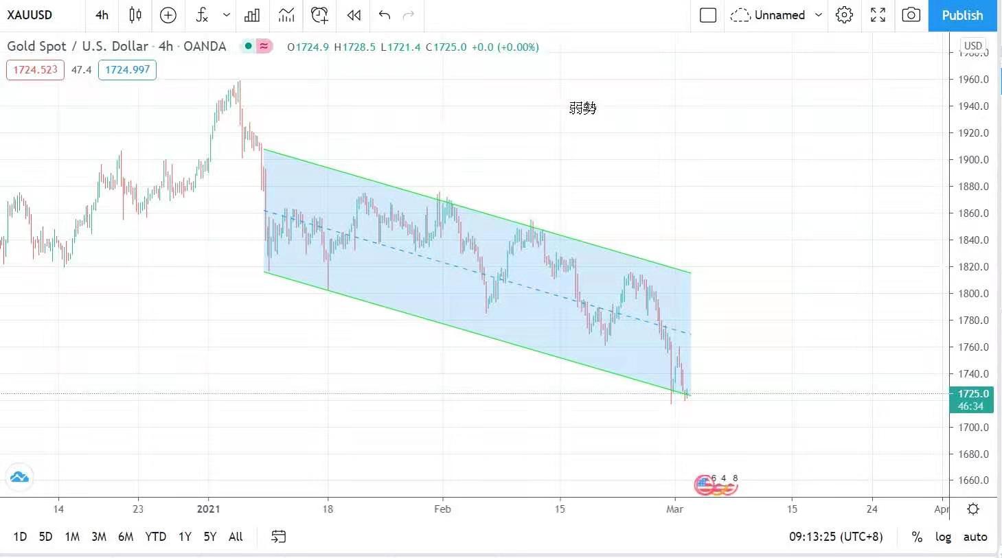 The price of gold fell further, with the lowest price falling to $1,719 per ounce, with a fluctuation of $41, and finally closed at $1,725 per ounce, down $9.