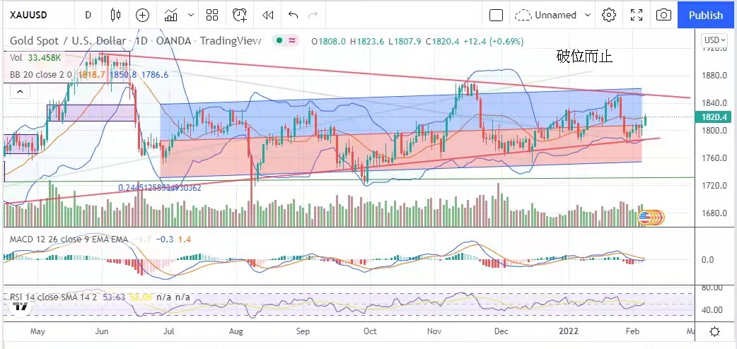 The central bank may raise interest rates early this year. The US dollar index went from rising to falling, and the price of gold broke, rising to a maximum of 1823.6 US dollars, and finally closing at 1820.4 US dollars, up 12.5 US dollars.