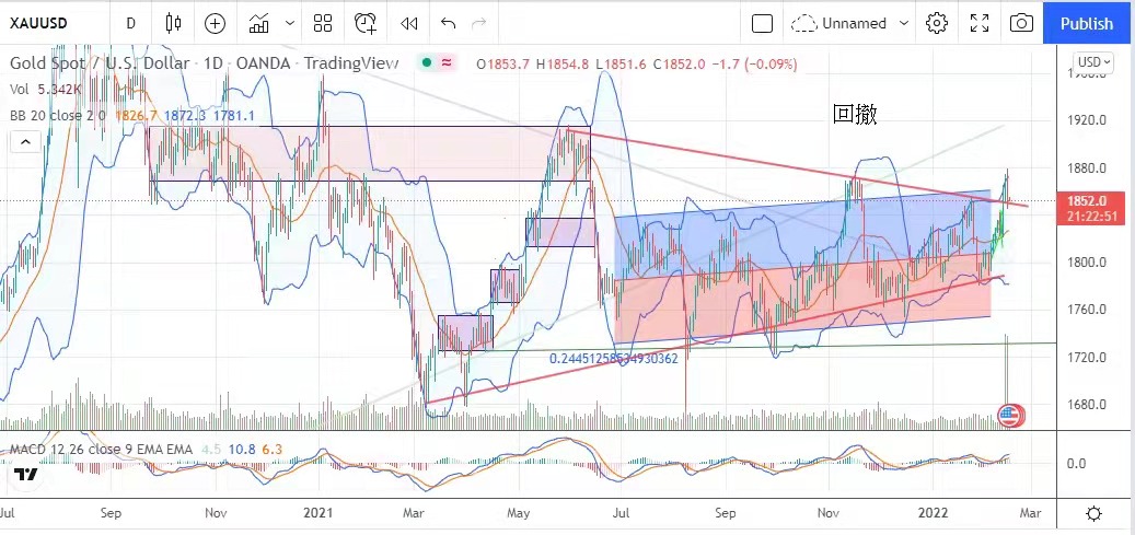 The price of gold retreated from a high level. In the early period, the price of gold continued to rise due to the development of the situation in Eastern Europe. Yesterday, the highest price reached 1,879.6 US dollars, successfully challenging the high in November last year. However, after the news of Russia's withdrawal, some safe-haven funds