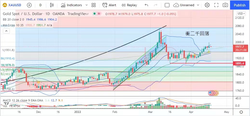 定俄乌战事,只会在双方分出胜负方会罢休。避险资金曾一度推升金价接近2000美元关口,金价最高升至1998.5美元,最低见1972.1,最后以1978.元