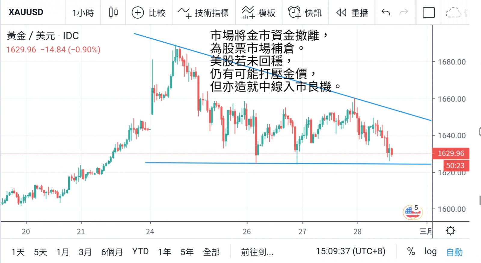 但由于美股跌市过急,基金机构以至散户都需要为股市进行补仓,导致从金市进行获利平仓,将资金调回股市,因此拖累了金市表现,不过随着金价回调,