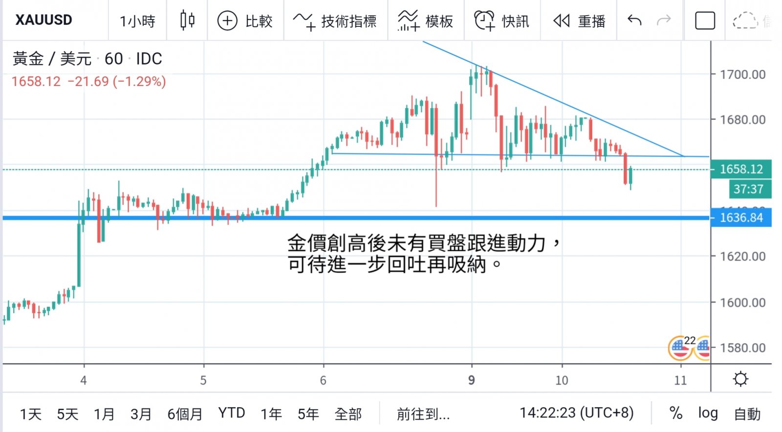 金价早段虽曾升穿1700美元,但上方未见承接买盘,加上股市暴挫,资金亦需从金市获利回流股市补仓,金价可能进一步回吐。