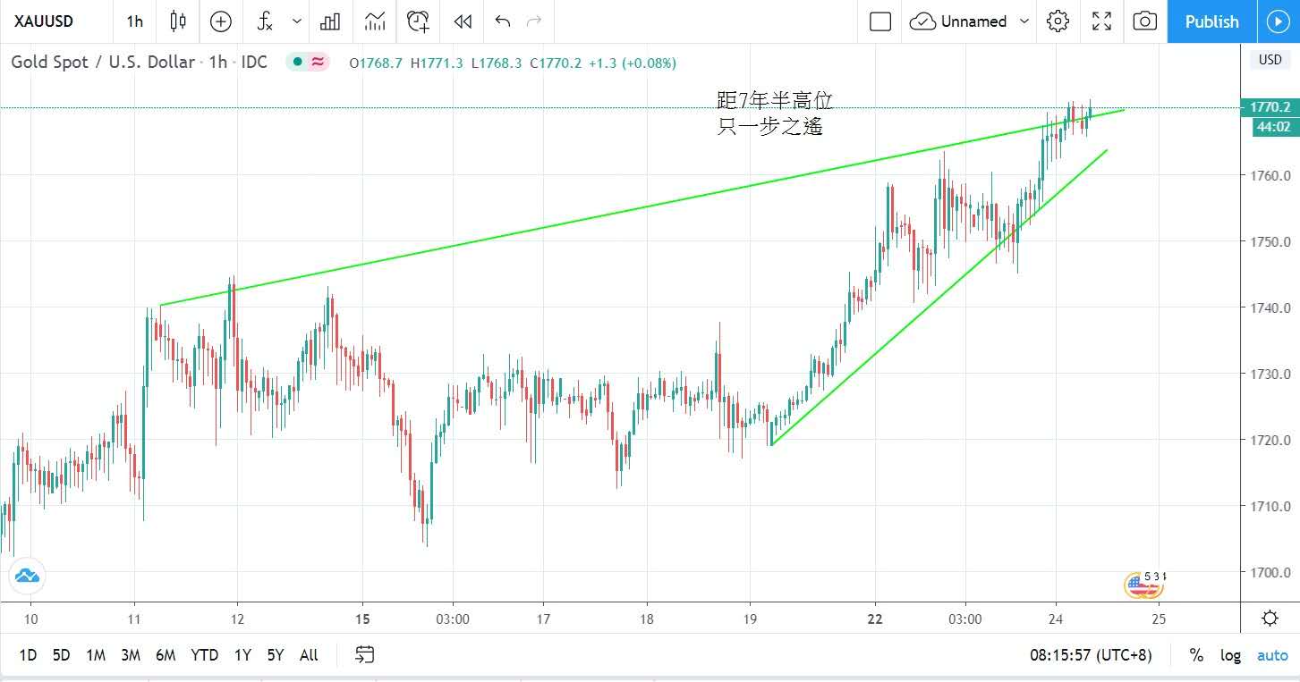 上升15.6美元,升幅0.8%,创逾7年半以来最高。离2012年10月12日高位的1773只一步之遥。油价先升后回,主要是市场预计美国原油库存将会增加。