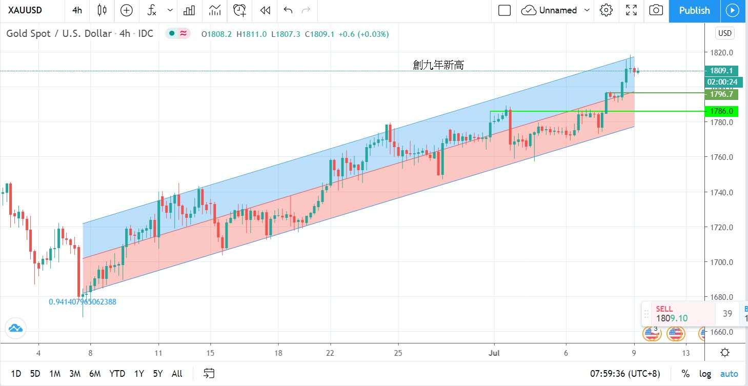 金价再破2011年11月新高,收市报每盎司1808美元。