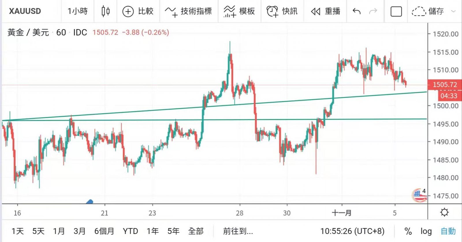 金价走势亦与欧币同步,下方跌至上周末的低位1504美元始作反弹;