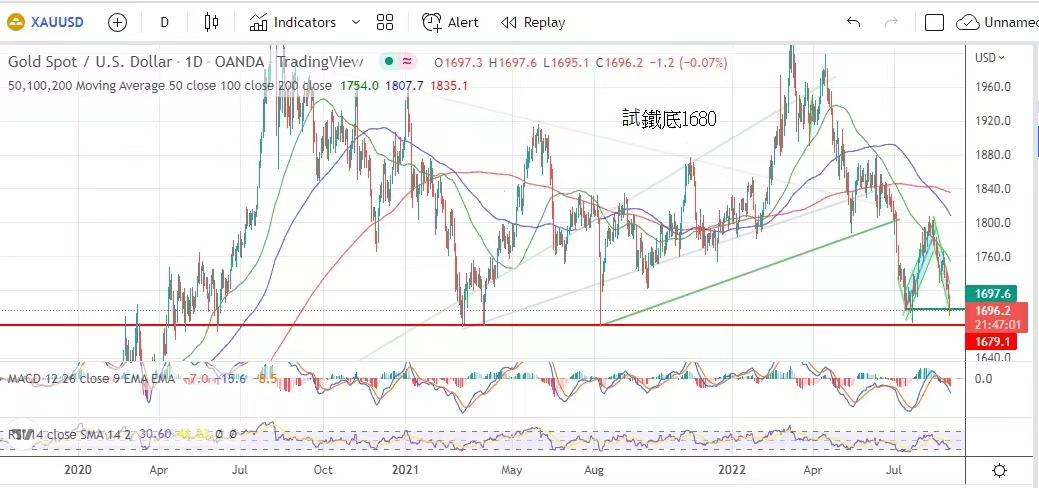 日有机会再次下试自病毒大流行以来的铁底,即约莫在1680美元之所在,跌穿则前景更灰!今日建议波幅1680美