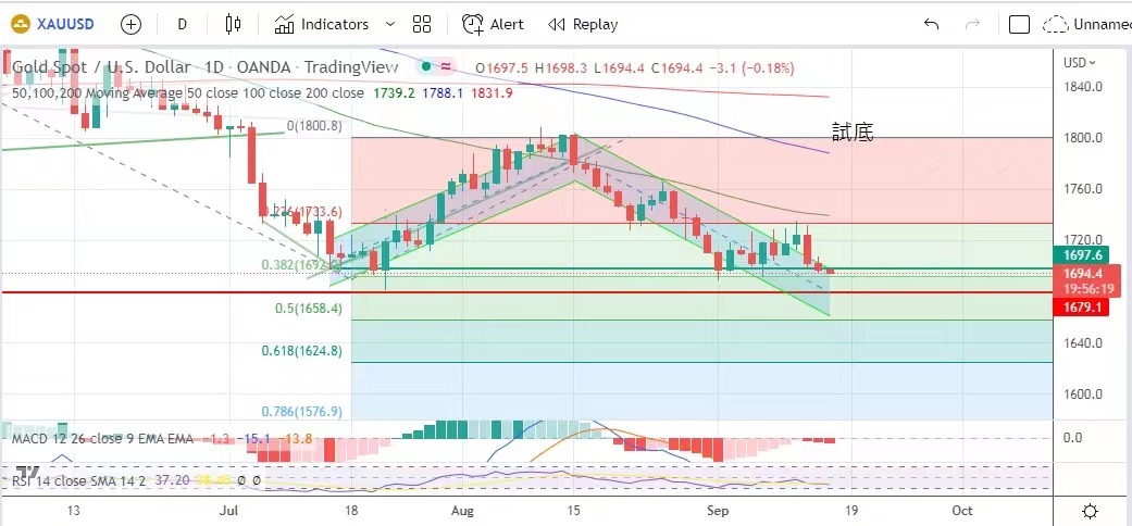 更激动的加息手段,金市最终录得下跌收场。金价昨日最高见1707.2美元,最低见1693.7美元,以1697.4美元收市,