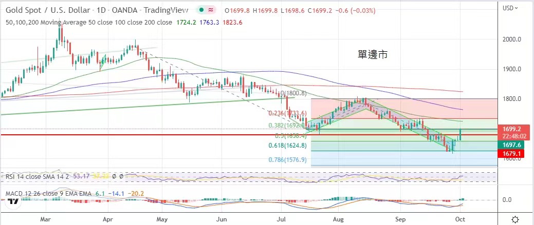 美国制造业指数活动出现收缩,市场忧虑美国经济下行,美元指数跌至111.6,同时,十年期国债孳息率亦下跌至3.6厘水平,提升了黄金的吸引力,金价出现单边市,明显近期会再冲1700关口并考验1678.8美元的支持。本周有非农数据出炉,数据将影响美联储的态度。今日的建议波幅为1690美元至1705美元。
