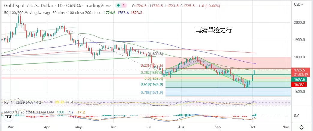 继周一公布的美国供应管理协会制造业指数走差后,昨晚公布的劳工数据亦同样低于市场预测,8月份美国劳工流动职位空缺数录得近2年半来最大跌幅,加上早上澳洲央行宣布加息的幅度出符意料低于市场预期,这都舒缓了美联储未来加息步伐预期的升温。金市开市早段稍为调整,金价最低跌至1695.2美元,即再次延续早日单边之行,最高见1729.6美元,最后以1726.5美元收市,升27.7美元