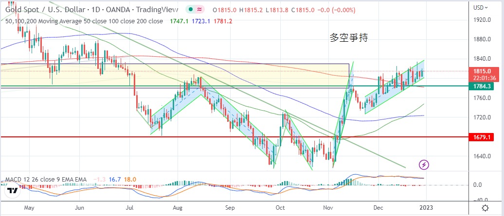 回收周三跌幅,金市多空争持,明显缺乏动力,但明显想保住1800美元过年。今日建议波幅1804美元至1822美