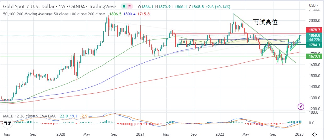 周期以来,由于息口上升,金价多番受压,但在2022年底创半年高位,虽然按年计算仍微跌5美元,然而市场憧憬