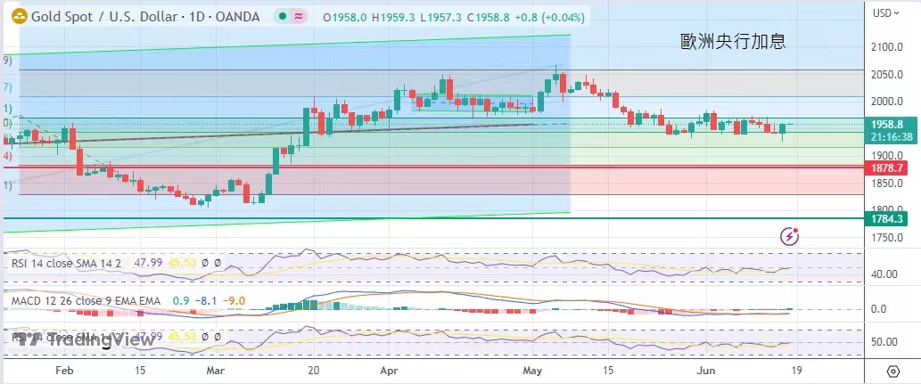 论般测试本年3月中的低位,欧洲央行宣布加息0.25之后,美元指数下跌至102点边缘,金价V型反弹。金价这