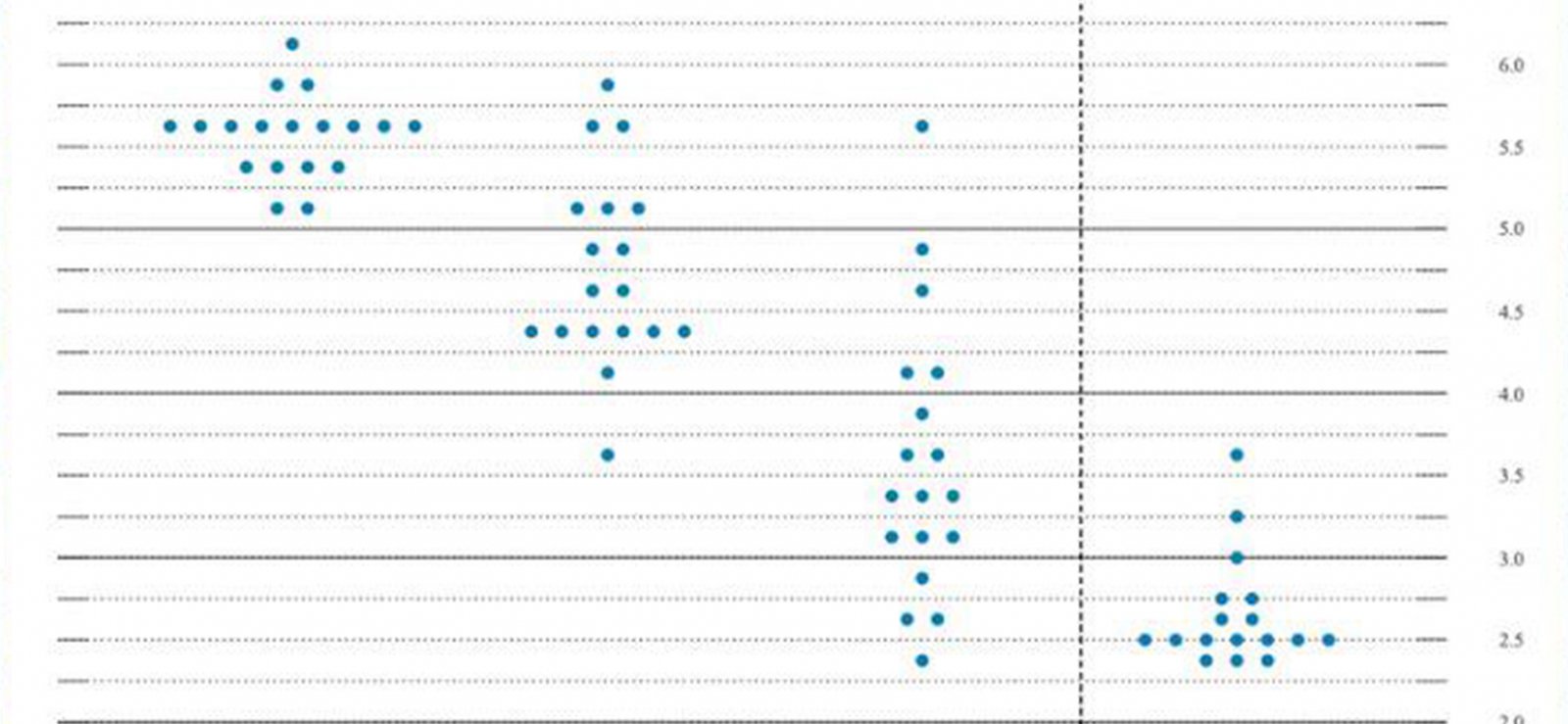 点阵图中每一个点代表一位央行行长对短期利率的预测若经济按照预期的路径发展,未来三年的联邦基准利率平均🪄。