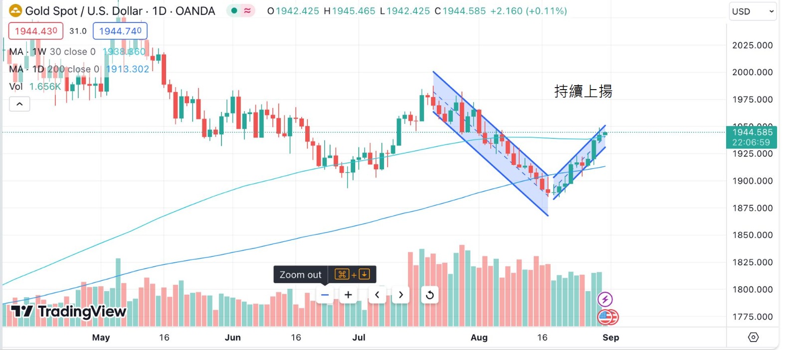 憬有助延后美联储加息政策,美元及美国十年期国债轻微回落,金市上行,金价最高见1949美元,最低见