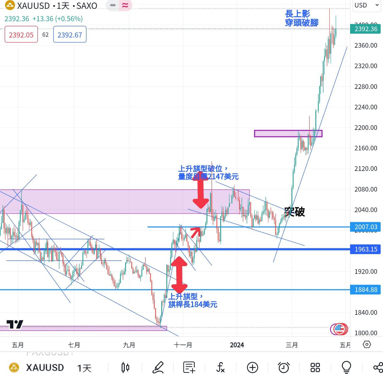 黄金回吐过后再爬升,中东局势紧张支持金价连升5周。金价经历了2023年1月以来最长连续升幅,累计五周共有约250美元升幅,增长超过1成。上周末时间,伊朗首次直接开火报复以色列,周末局势较为紧张,令周初时间金价跳空爬升,但随着美国并不支持以色列反击,加上伊朗亦未再有进一步开战计划,金价再度回落,跌穿前周回吐低位,但回吐过后,买盘积极吸纳,让金价守稳2300美元关口。近期美元及黄金罕见同步出现升幅,美联储官员纷纷应对早前通胀回升,及不俗经济数据,而放出鹰派言论,令美元升上106水平,多只亚洲货币呈弱势,但金价整体未见跌幅,每次回吐均能马上企稳,周五更承以色列还火而重上2400关口;中东局势近期可谓惹火,任何擦枪走火也令资金流入金市避险。加上央行积极买盘,似有无形之手托市,令黄金无视美元强势而保持大涨小回格局。展望本周,有多项经济数据公布,若显示美国经济之旺盛,将会继续打击美联储减息周期的开始,现时利率期货已显示9月减息机会降至67%。而周末的PCE更是全周重点,前周CPI曾打压金价回吐至2320附近位置,若通胀继续高企,纵使未必能扭转黄金升势,但亦会出现较深回吐,令市场出现更理想吸纳位置。市况点睇,不妨互相参考一下。