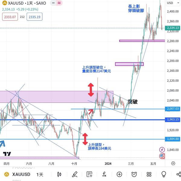 而周中美联储的放鹰,直接扭转了黄金近两周的升势,美联储公布上次议息会记录,显示出局方对近期通胀的关注,甚至表示进程不理想,有需要将会继续加息。这无疑对市场一直等待的减息周期背道而驰,金价一泻而下,期后连续两天大跌近100美元,创去年12月以来最大单周跌幅。