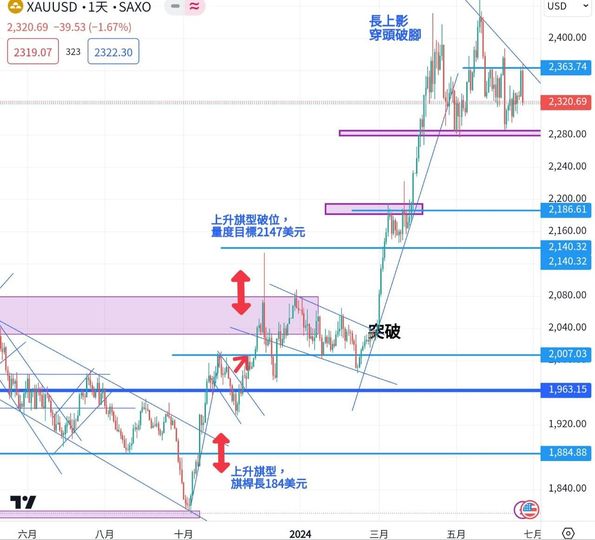 图表上,金价曾于2440附近位置形成双顶,而近两浪顶分别位于2387及2368,出现了一浪低于一浪的走势,若要扭转弱势,定必需要破顶运行。本周美国将公布PCE物价指数,通胀数据若然改善,则美联储可望更有筹码开始减息,否则高通胀定必会继续高息,恐对黄金不利。市况点睇,不妨互相参考一下。