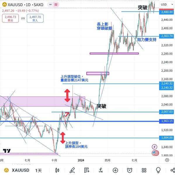 市场未见劳工市场全面恶化,令金价周五前回跌,但仍守稳key level,收报2497.23,全周只限盘整。
