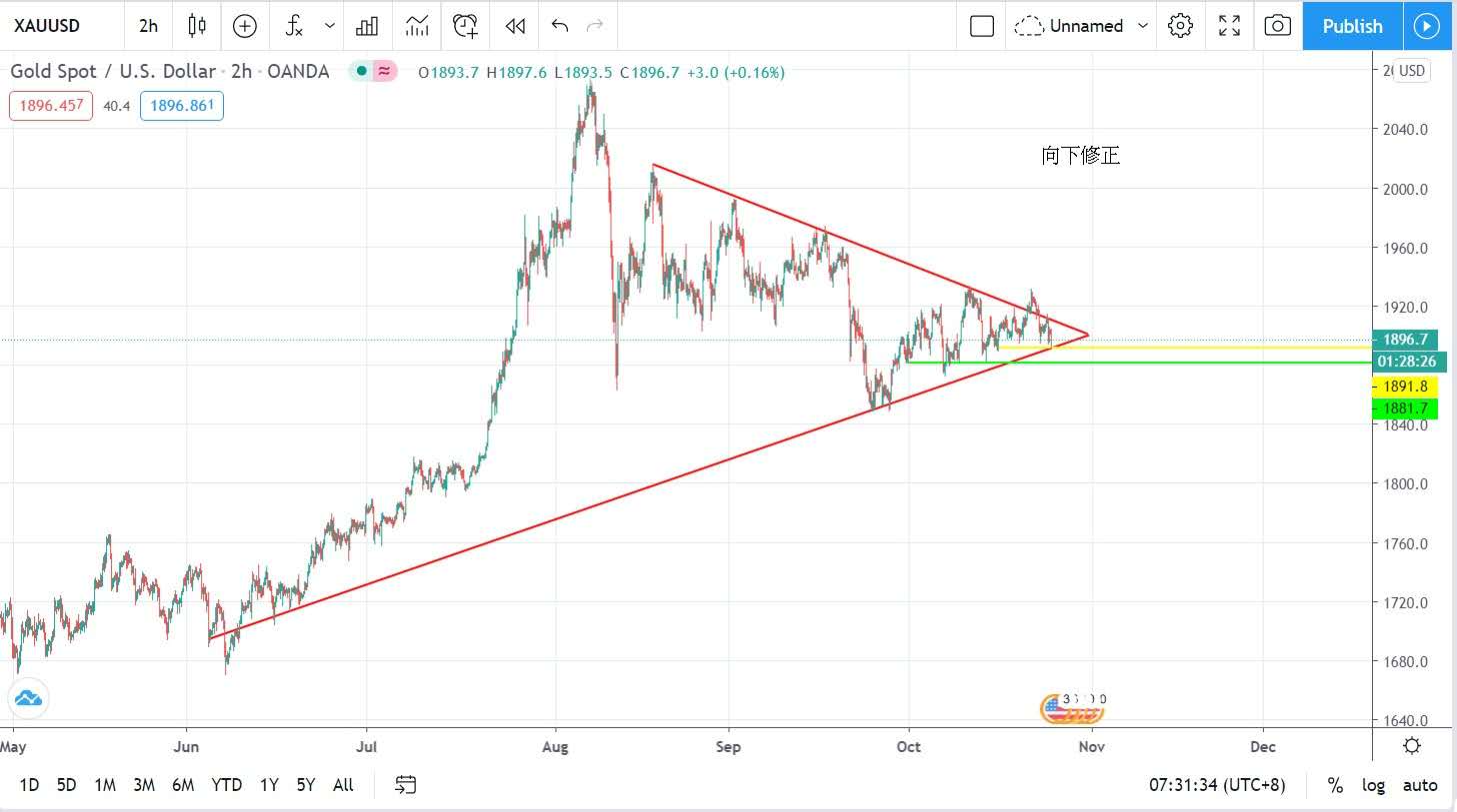 最高曾升至每盎司1931美元,最差曾跌破1900水平见每盎司1895美元,上周收市报每盎司1901美元,一星期微升2美元。金价在上星期曾向上假突破,并重返收歛三角中寻新方向,