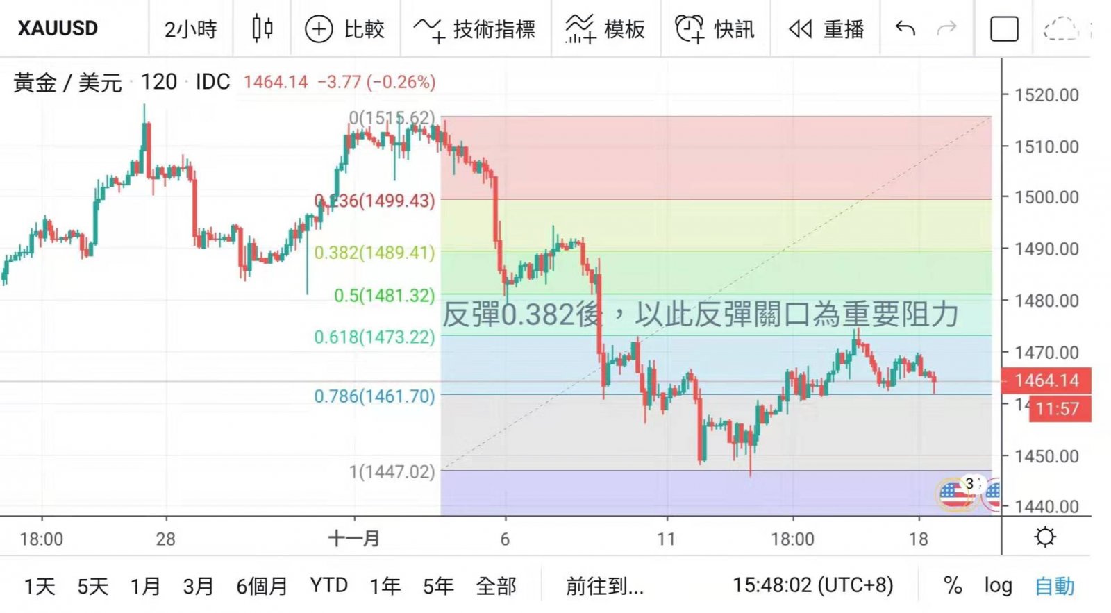 金价上两周急跌后,1450下方有实质买盘支持,最高弹至1474位置,但未有力重新挑战1480阻力,