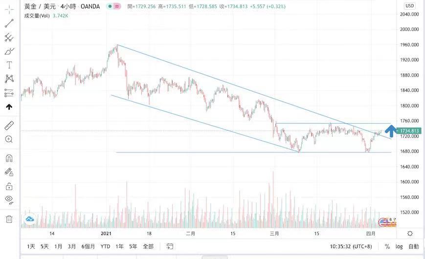 金价走势已摆脱下降压力线,升穿横行底部。昨日上试近期高位1733,美元指数偏弱,有利黄金后市,