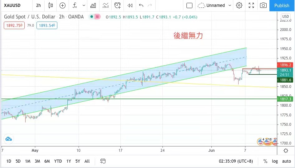 昨日金价继续震荡,一度升穿1900美元这个心理关口,但无以为继,预料短期仍将震荡。今日建议波幅在1882-1904。