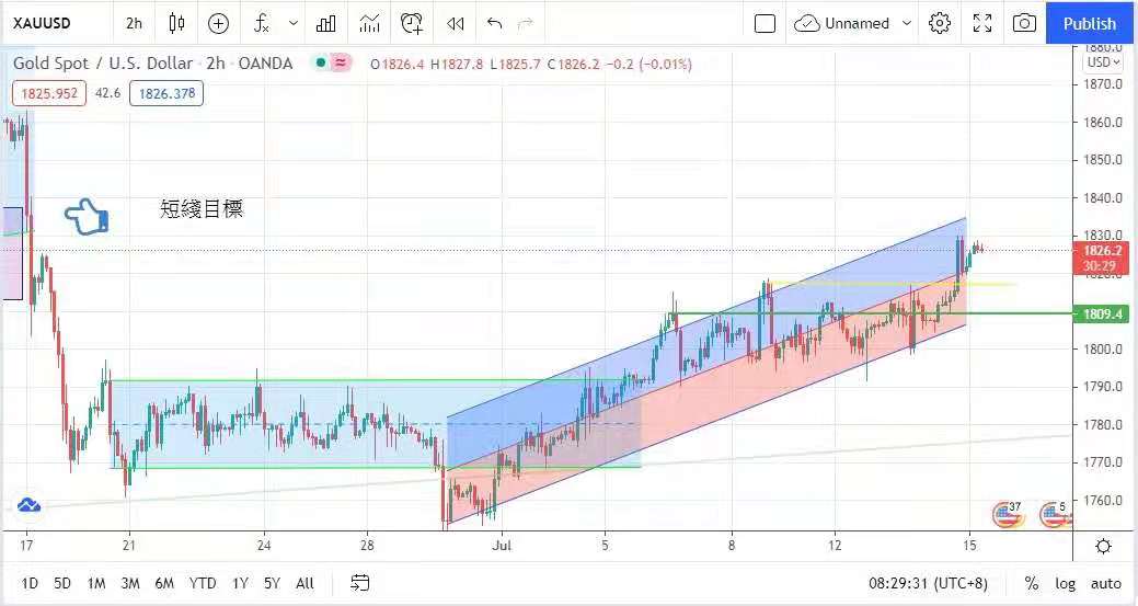 讯息带旺金市上行。金价在上月中急速下跌,彷似自由落体,升上去亦可能无阻力;假若金价企稳在1820美元,短线目标为6月17日两小时图下跌的