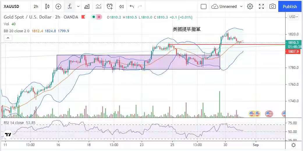 美国提早一日完成从阿富汗撤军,避险情绪降温,金价昨日从高位回落。全球量化宽松已看到终点,美国缩表一定会在今年结束前开始,只余幅度是多少的问题,而美联储仍关注变种病毒影响就业市场表现,将加息步伐推迟。市场亦观察本周的非农数据,限制了金市的波幅,金价昨日收窄至15美元,利率偏低有利黄金这个不生息的投资工具,但本周有非农数据,就业表现将影响美联储减少买债的时间表,预料今日仍然窄幅波动。今日建议波幅在1806-1820之间。