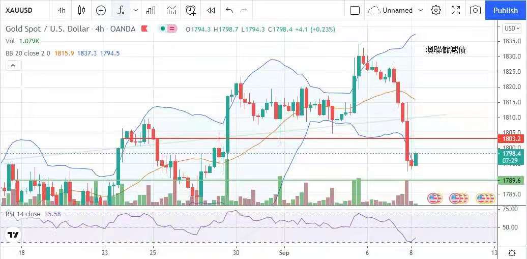 昨日金价调整已反映美联储缩表在即,之后发展是看美联储的减买幅度。金市走势相对强弱指数跌至30边缘,今日预料仍将震荡,建议波幅在1790-1802美元之间。