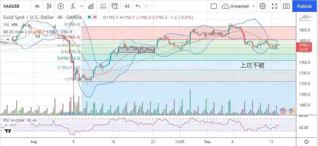 金价仍处于8月9日大调整之后的一波反弹的回调状况,并测试黄金比率0.236及0.382的阻力与支持,昨日上攻不破,下跌亦未能穿,市场关注反映通胀的物价指数,预料金市今日继续震荡,但短期目标1778美元不变,建议波幅在1778-1800美元之间。