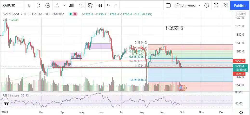市场预期美国国会一定会让提高债务上限的申请得以通过,更大的流动性将推使美国通胀加据,预期美联储在11月开始闩水喉的声音高唱人云,美元持续走强打压金市。金价昨日考验1720的支持,今日建议波幅在1720-1735美元之间,跌穿1720美元追沽,1723止蚀,搏见1711美元。