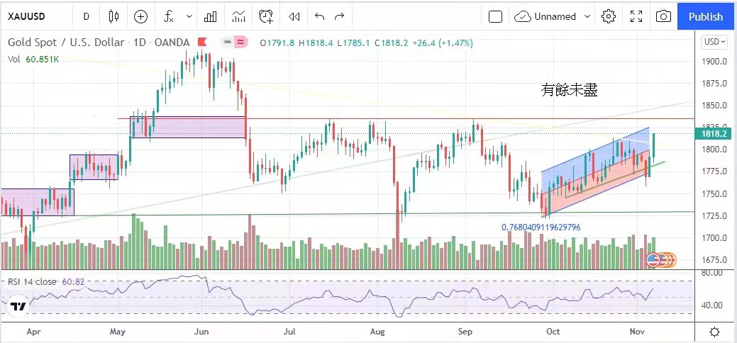 上星期,金市上升。上周美联储宣布维持利率不变,联储局主席鲍威尔称,尽管局方启动减买债的行动,但并不意味着发出利率政策讯号,并强调现在并不是加息的