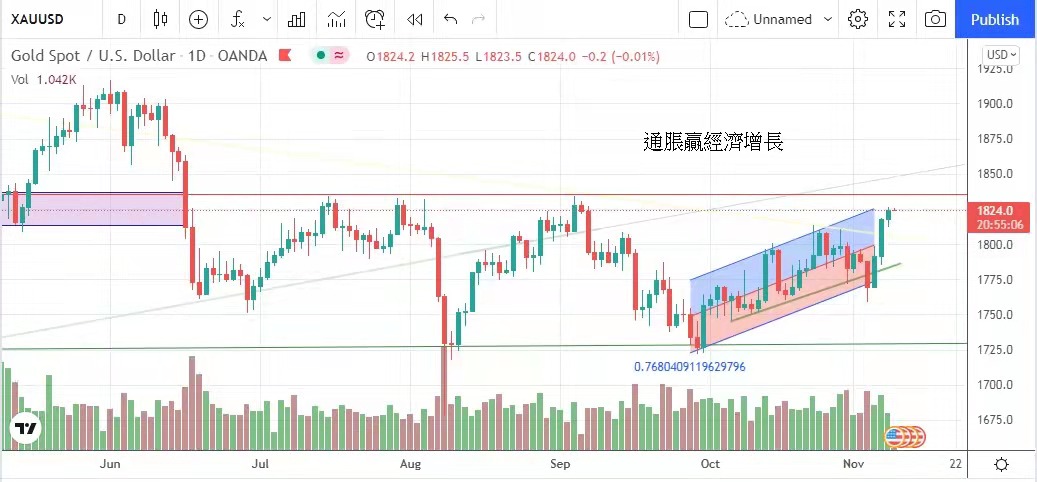 市场押注通胀增长胜过经济复苏,美元指数跌近94点,加上美联储对于加息立场摇摆不定,支持金市上升。金价昨日最低见1812美元,最高见1826美元,
