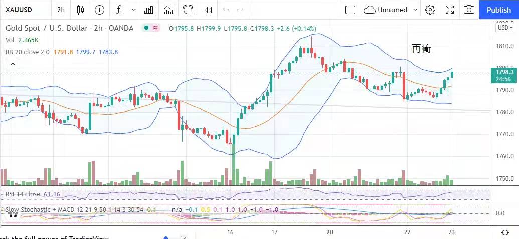 金价又再冲击1800美元,昨日金价开市曾低走至1786美元后便调头向上,美国经济数据造好,但美元指数与十年期孳息率向下,金价双重受惠