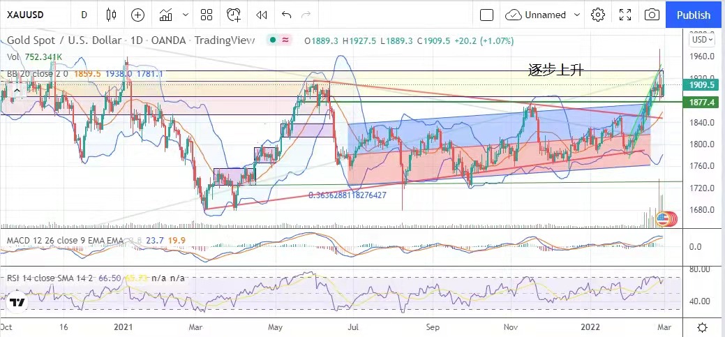 金价上周五收于1889.3美元,昨日开市即裂口上升,最高曾升至1927.5美元,原因是俄罗斯总统变本加厉,一方面与乌克兰会谈开始有进展的情况下,