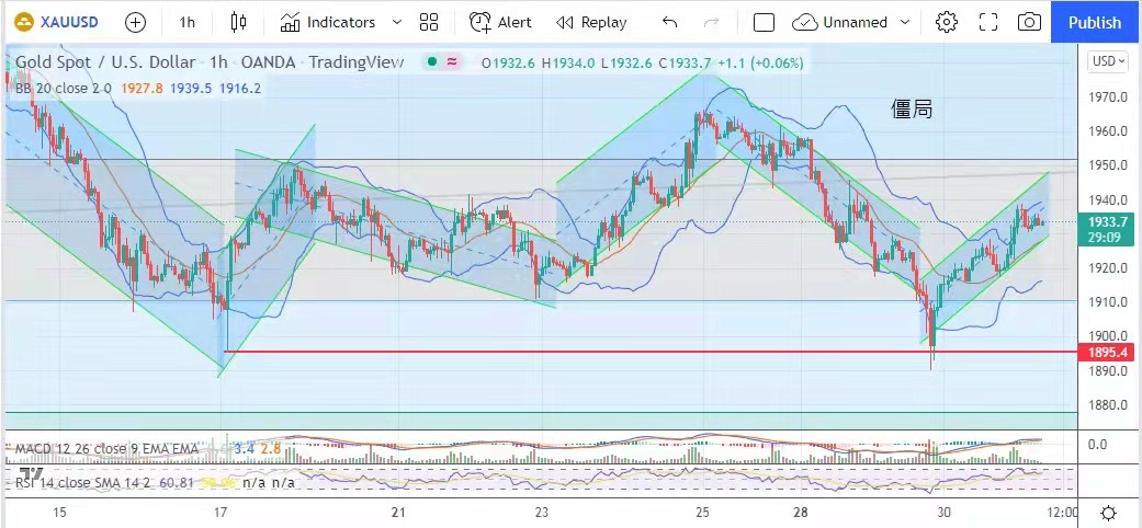 影响,金价最低见1916美元,最高造1938.6美元,最后以1932.6美元收市,升13.1美元。