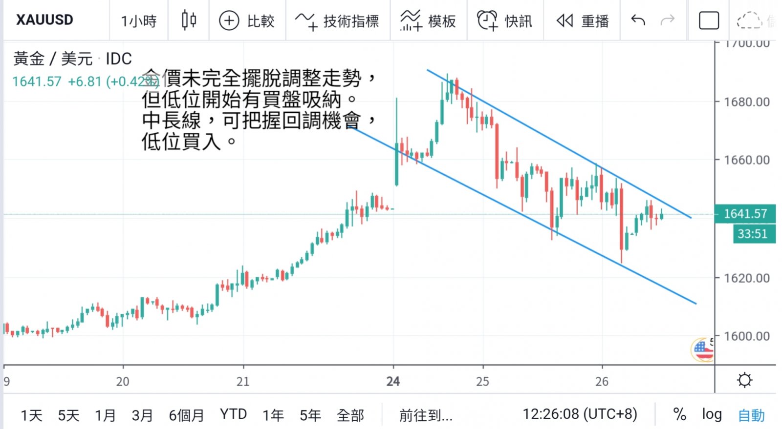 經週初市場的劇烈震盪後,市場波動會開始收窄。金價未會即時脫離調整格局,上方較難即時重回1650上方,挨近位置可短線沽空,