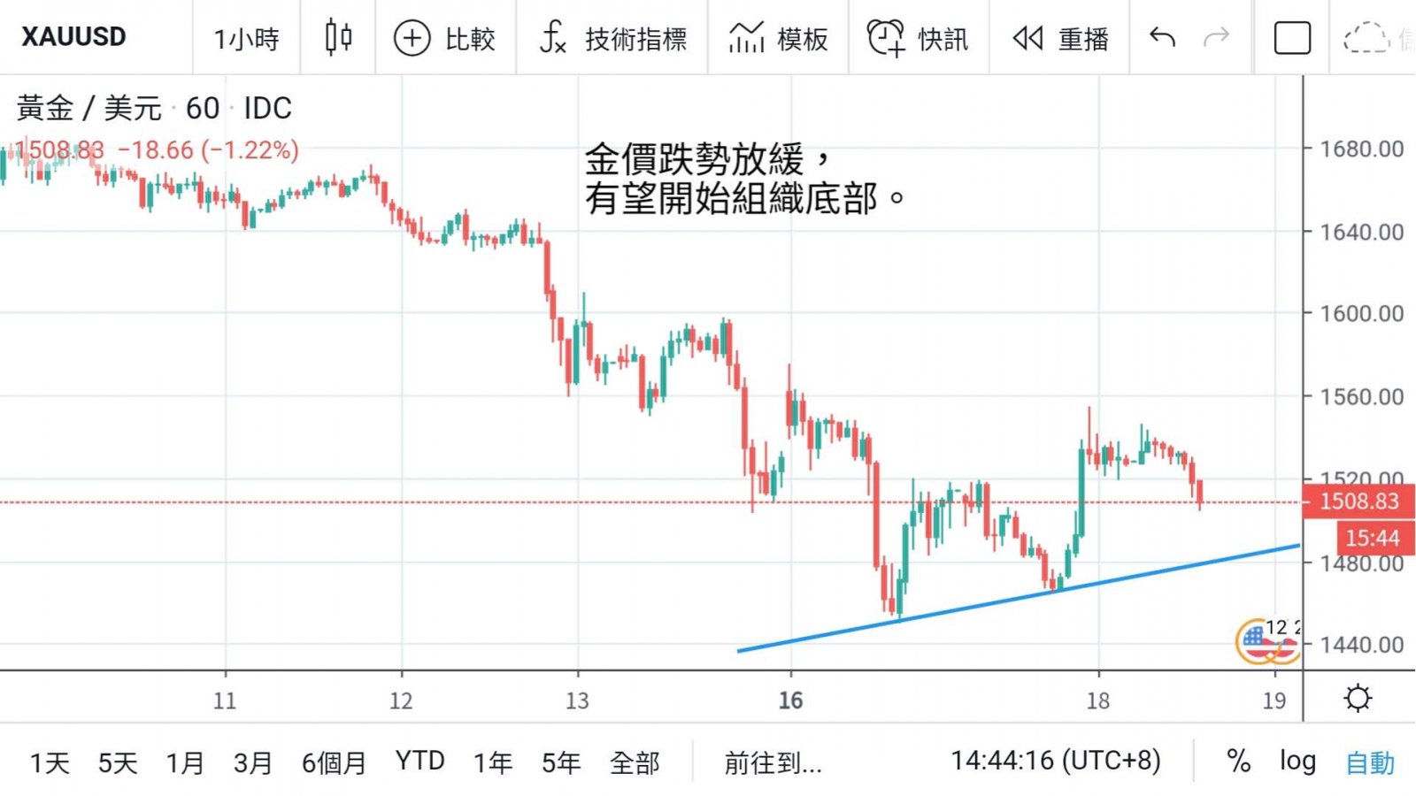 金市自1700美元回落後,跌幅已逾二百美元,週內曾見1450關口得到實質買盤支持,此水平有望成為中期底部,組織底部後,將可逐級反彈。