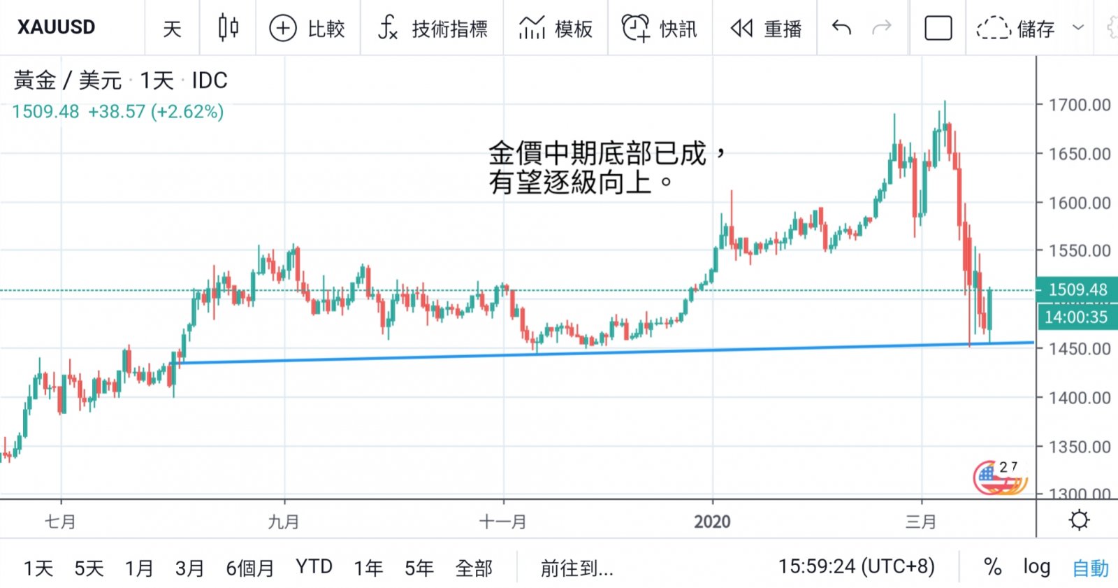 金價亦因此從低位開始反彈。今日下午再見金價又挑戰1500美元上方,整固多段後,金價有望逐級靠穩,開始重組升勢,