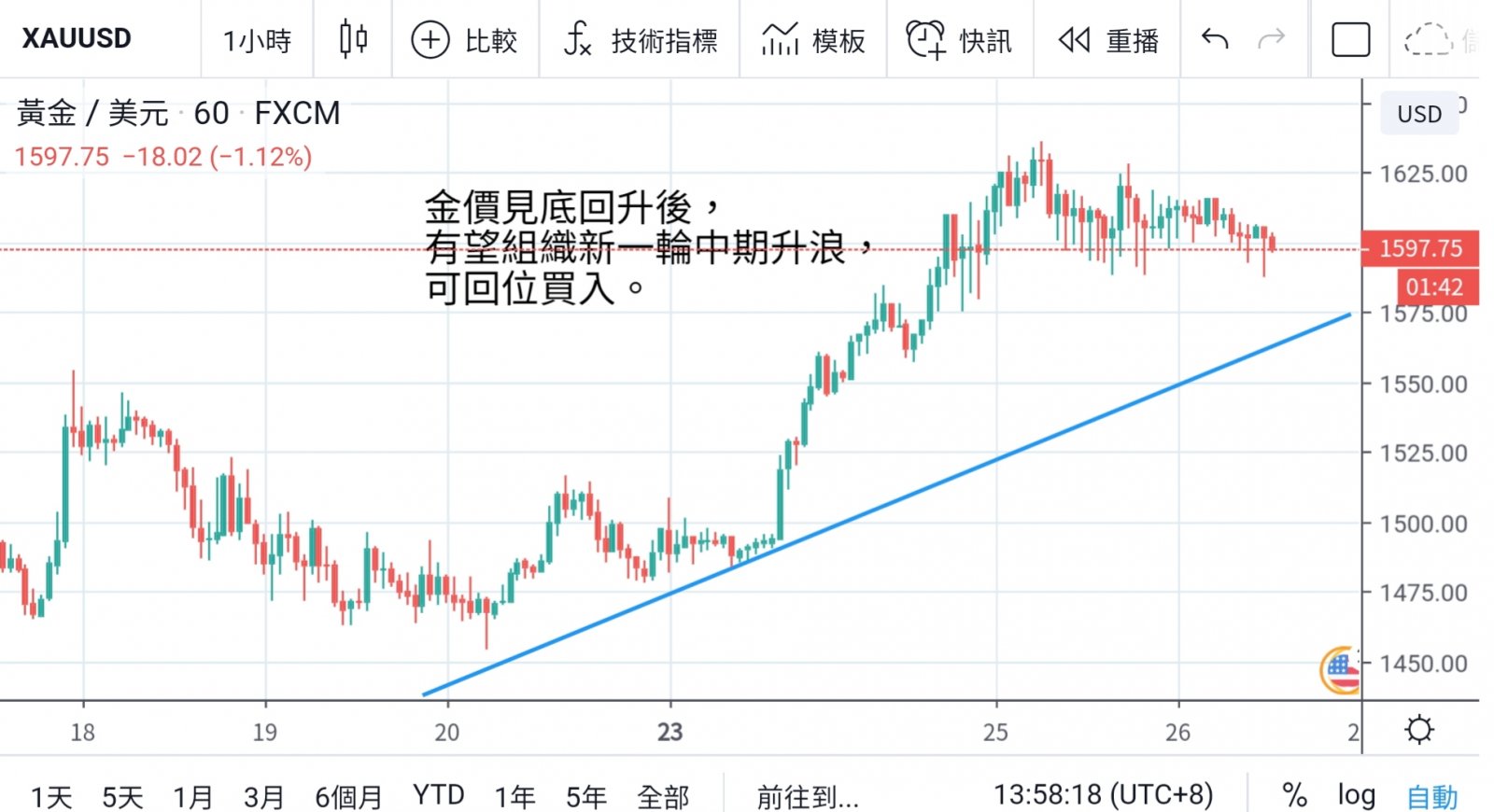 下方可繼續於1590位置買入,逢低吸納,在各國印鈔放水下,金價會繼續受到支持而表現勢。