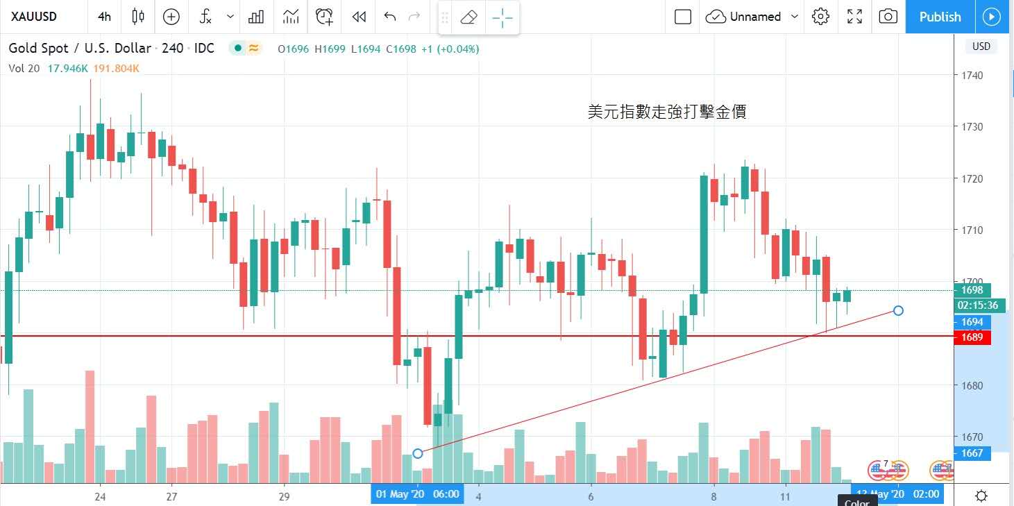 市場預期負利率不在短期內發生,然而貼緊0水平亦使美元强勁,美元指數收100.2並打壓金價。金價失守1700,在美交易時段內最低跌至1692以1698收市。