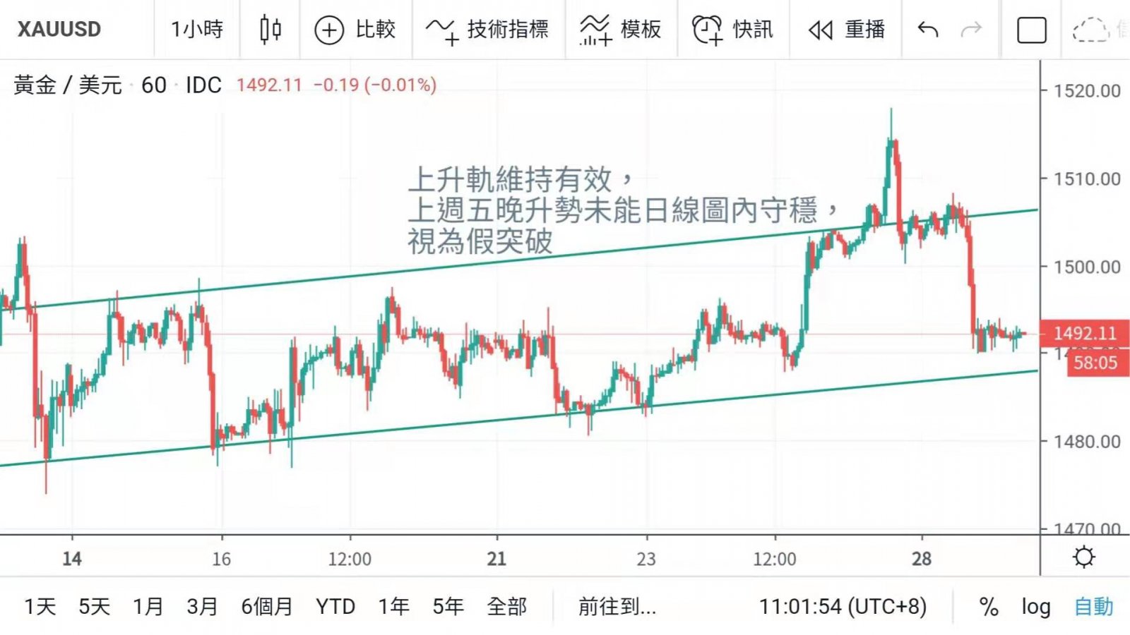 技術上,金價重回上升軌內運行,未有成功突破上升軌頂部,整體仍處於升勢。