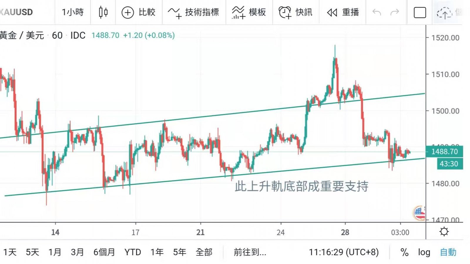 金價早段時間於1490附近徘徊,仍欠缺反彈動力,達入歐洲市中段,金價進一步調整,